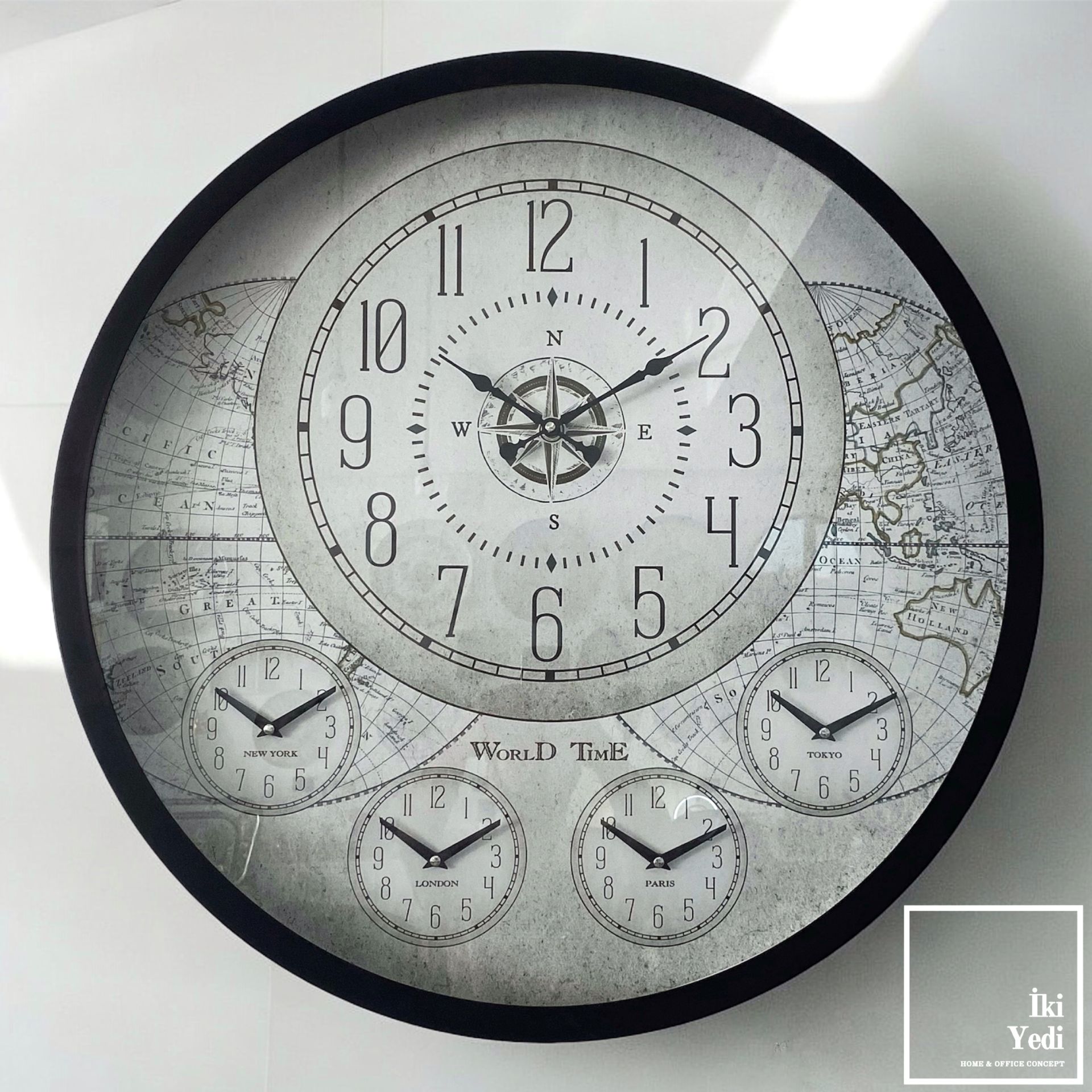 Zamanı sadece anımsatmaz; aynı anda dört farklı kıtada yaşıyormuş hissi verir. İki Yedi Home & Office Concept tarafından sunulan bu 80 cm çapındaki Dünya Saatleri Duvar Saati, hem estetik hem de işlevsel bir tasarımla zamana değer katıyor. Merkezdeki büyük saat, bulunduğunuz yerin saatini gösterirken, alt kısımda yer alan New York, Londra, Paris ve Tokyo saatleri farklı zaman dilimlerini takip etmenizi sağlar. Minimal vintage harita fonu, keşif ruhunu çağrıştırırken, pusula motifiyle de nostaljik bir dünya gezgini havası yaratır.