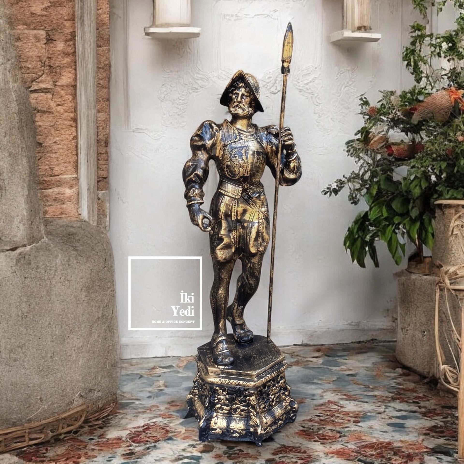 Tarihi ihtişamı dekorasyona taşıyan bu Roma askeri heykeli, detaylı zırh ve mızrak figürüyle göz alıcı bir görünüm sunar. Büyük boyutlu tasarımıyla giriş alanları, ofisler ve salonlarda etkileyici bir duruş sergiler. Antik dönem figürleri, Roma dekor objeleri ve savaşçı bibloları gibi sık aranan anahtar kelimelerle öne çıkan bu parça, klasik stil sevenler için özel bir koleksiyon ürünüdür. Mekânınıza karakter katar.