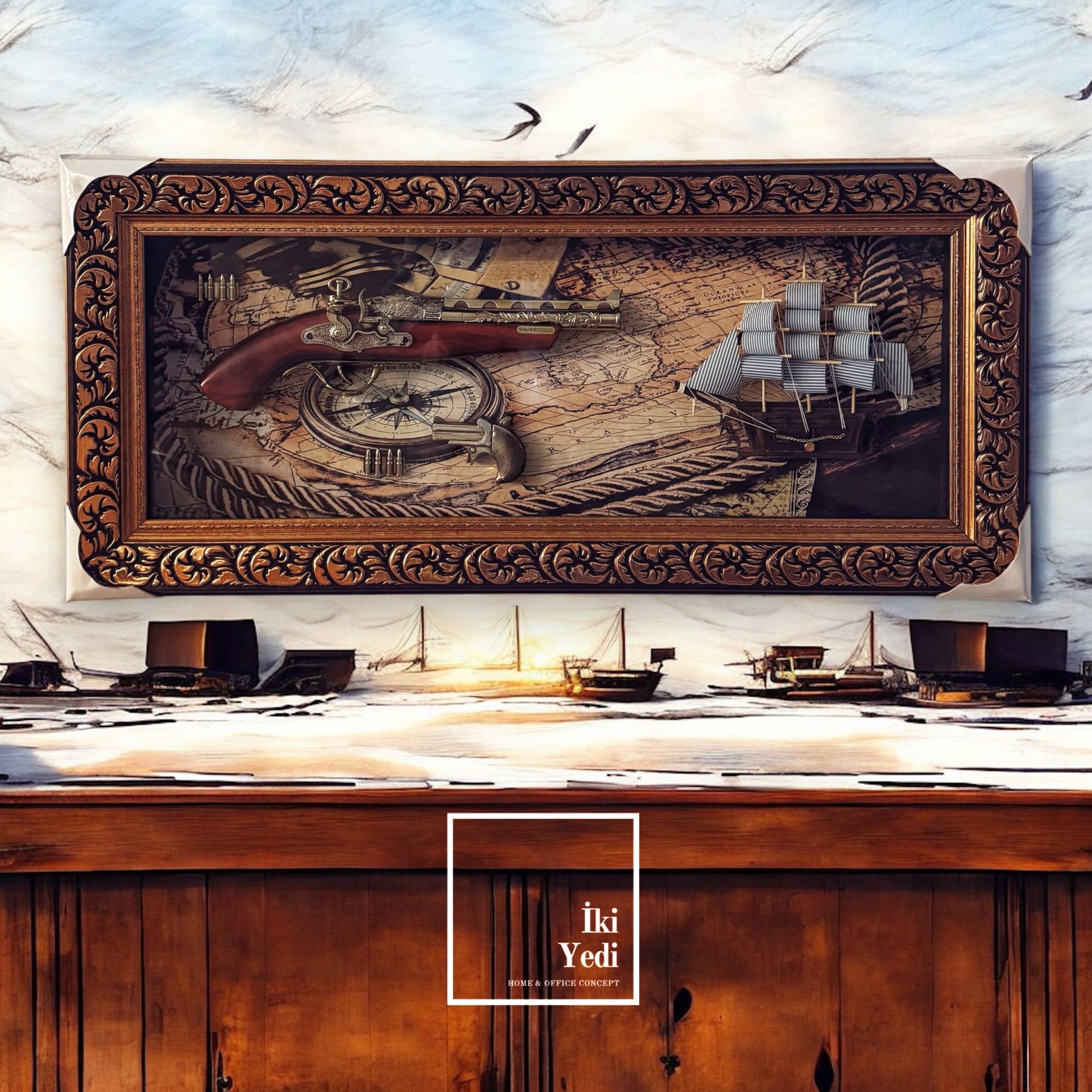 Pedro-M 77-2 Antika Silah Tablosu Yelkenli Gemi ve Dünya Haritası Temalı Lüks Duvar Dekoru