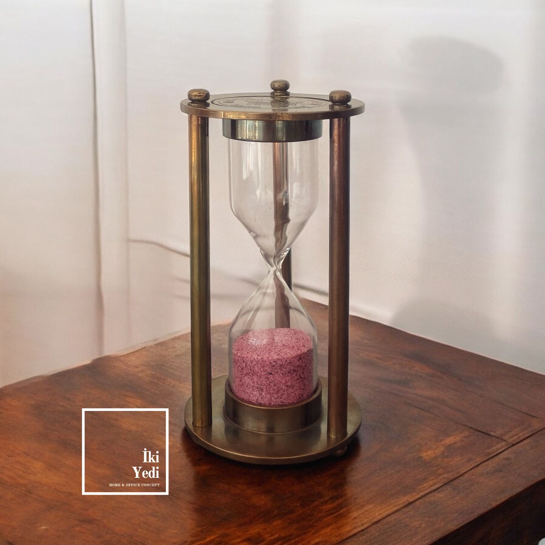 MQ-London Pirinç Eskitme Antika Kum Saati, 3 dakikalık süre ölçümü ile zamanın klasik ve zarif bir simgesi olarak ofisinizde ya da evinizde yerini alacak. Küçük boyutuyla her türlü masa üstünde şıklığıyla dikkat çeken bu aksesuar, pirinç eskitme tasarımı ile antik bir dokunuş sunar. İş hediyesi veya dekoratif amaçlı kullanılabilecek bu obje, nostaljik havasıyla mekanlarınıza farklı bir atmosfer katarken aynı zamanda işlevsel bir zaman ölçme aracı olarak da kullanıma uygundur.