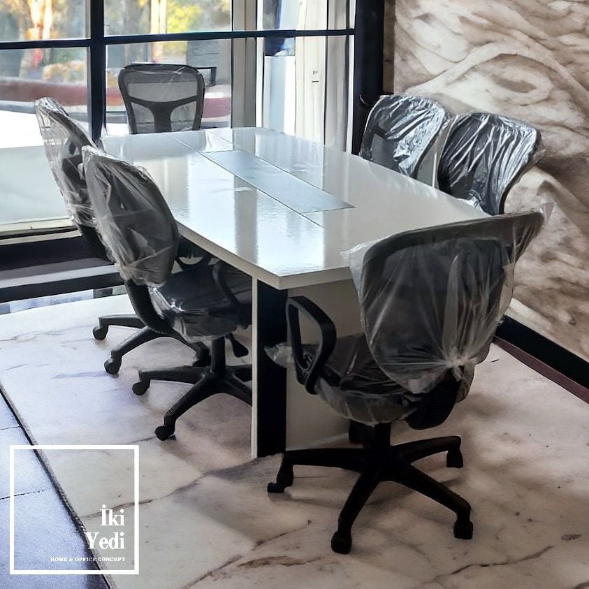 Nouvin 36 mm Sümenli 200 cm ( 2 Metre ) Toplantı Masası ve Personel Sandalye Takımı 6 Kişilik Seti Ofis Mobilyaları Büro Mobilyası Beyin Takımı Siyah Beyaz