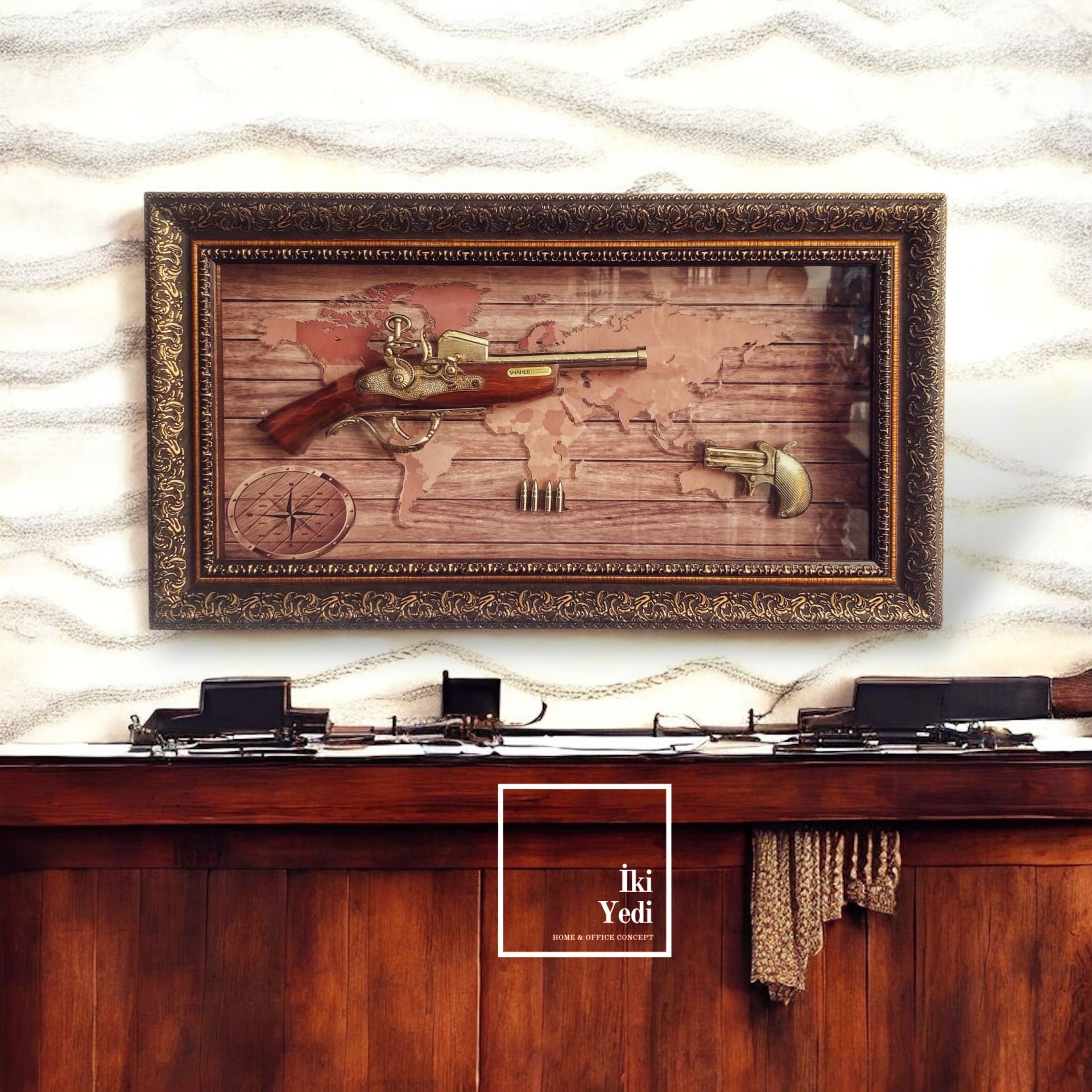 Pedro-S 77-2 Antik Silah ve Dünya Haritası Temalı Tablo – Lüks Ofis Duvar Dekoru, VIP Hediyelik
