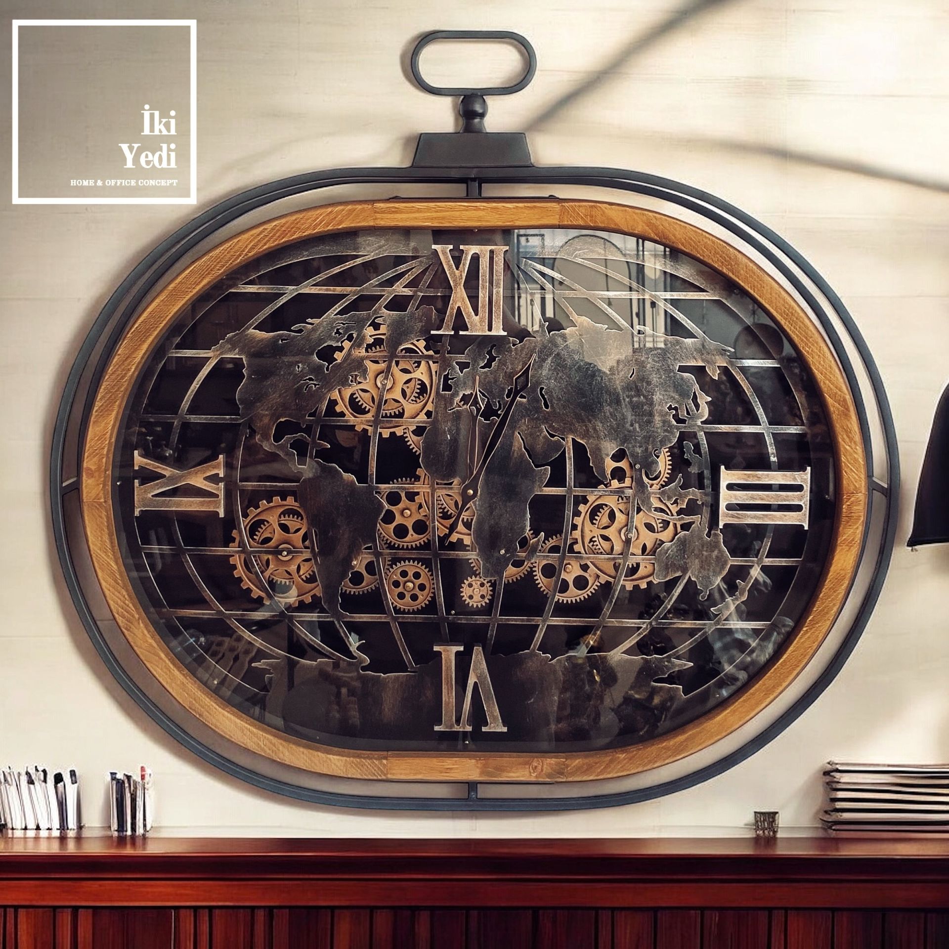 Doncaster 86 cm Ayaklı Çarklı Saat, Ahşap Metal Dünya Haritalı Mekanik Saat, Lüks Ev Ofis Hediyesi