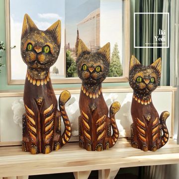 Tizzy 30 cm 3’lü Ahşap Kedi Figürü Takımı Otantik Dekoratif Obje Seti, Ev ve Ofis