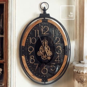 Udinese 91 cm Oval Döner Çarklı Duvar Saati, Ahşap Metal Lüks Büyük Boy Ev Ofis Saati